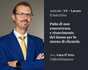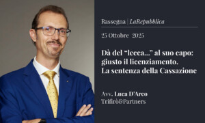 Luca D’Arco, avvocato dal 1999 e cassazionista dal 2015, ha maturato la propria esperienza nell’ambito del diritto del lavoro, sindacale, prestando consulenza e assistenza giudiziale e stragiudiziale per primarie Aziende italiane e multinazionali estere, con particolare riferimento a quelle operanti nei settori dell’industria metalmeccanica, commercio, chimico farmaceutico, assicurativo, logistica, multiservizi, facility management&global service e autoferrotramviario, postale, bancario e turismo, in importanti operazioni di ristrutturazione e riorganizzazione aziendale, fusioni, trasferimenti d’azienda o di rami oltre che nella gestione dei rapporti di lavoro anche dirigenziale, nonchè di agenzia, ovvero di collaborazione parasubordinata o autonoma. Luca presta regolare attività di assistenza giudiziaria a favore di primarie Società presso tutte le magistrature in tutto il territorio nazionale, compresa la Suprema Corte di Cassazione, in diversi campi tra cui impugnativa di licenziamenti individuali e collettivi; procedimenti per comportamento antisindacale; interpretazione e applicazione contrattazione collettiva, nonché per i contenziosi contro gli Enti previdenziali ed assistenziali e gli Ispettorati del Lavoro per quanto attiene alle violazioni relative a normative del rapporto di lavoro.