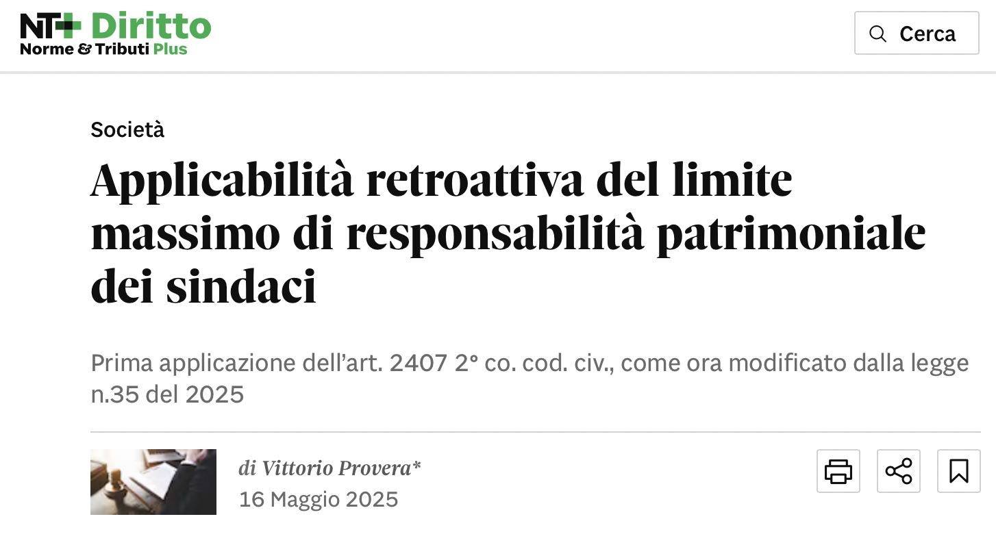 Condividiamo l’articolo dell’Avv. Vittorio Provera, apparso il 16 Maggio 2025 su NT+ Diritto | Il Sole 24 Ore, che affronta il tema dell’applicabilità retroattiva del limite massimo di responsabilità patrimoniale dei sindaci, a seguito della prima applicazione dell’art. 2407 2° co. cod. civ. (come ora modificato dalla legge n.35 del 2025) da parte del Tribunale di Bari.