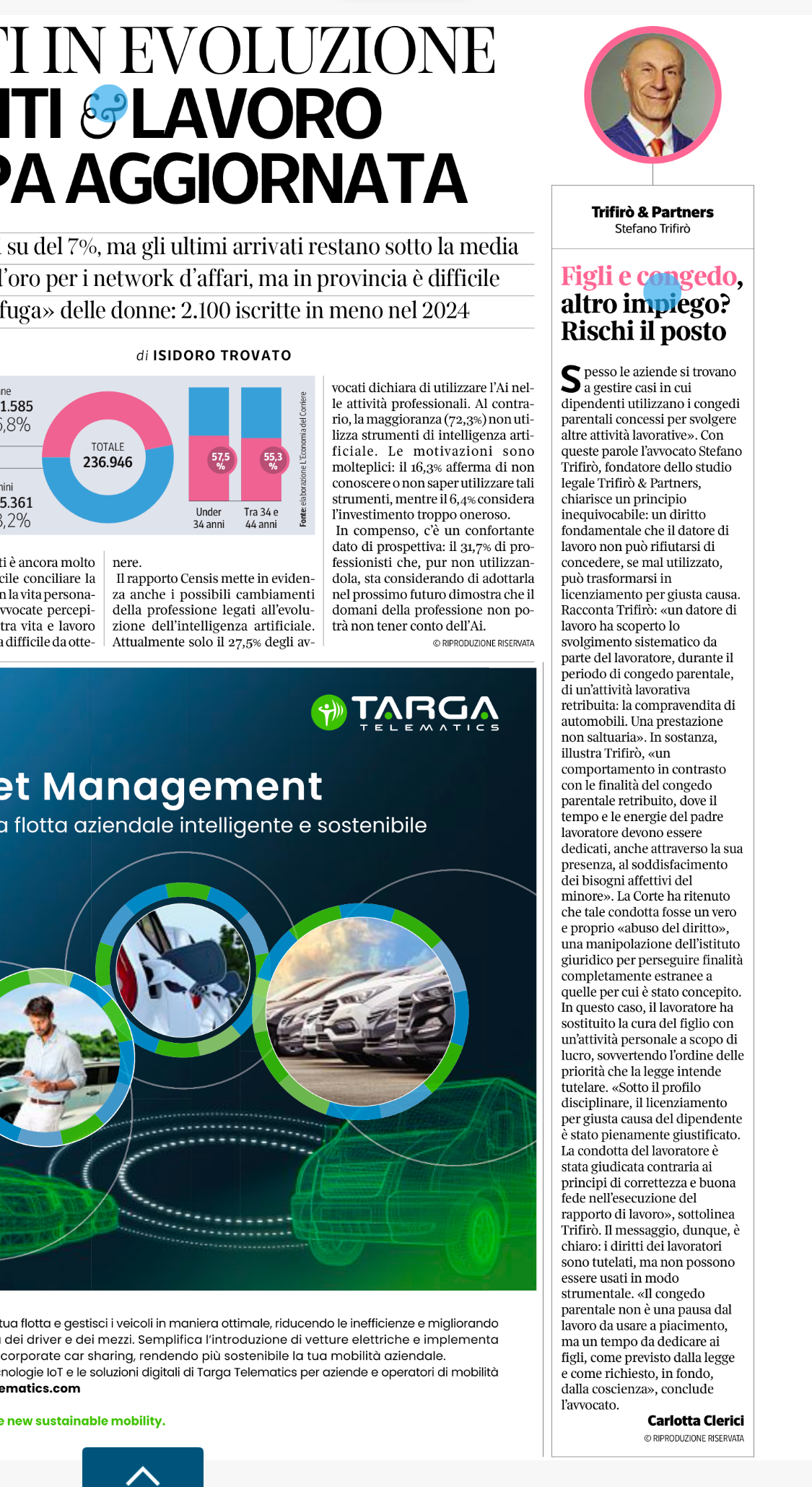 Condividiamo l’approfondimento dell’Avv. Stefano Trifirò, Trifirò&Partners Avvocati, pubblicato il 22 Aprile su Corriere Economia, sul tema del congedo parentale e di come l’utilizzo improprio di tale diritto, come lo svolgimento di un’altra attività lavorativa, possa condurre a licenziamento per giusta causa.
