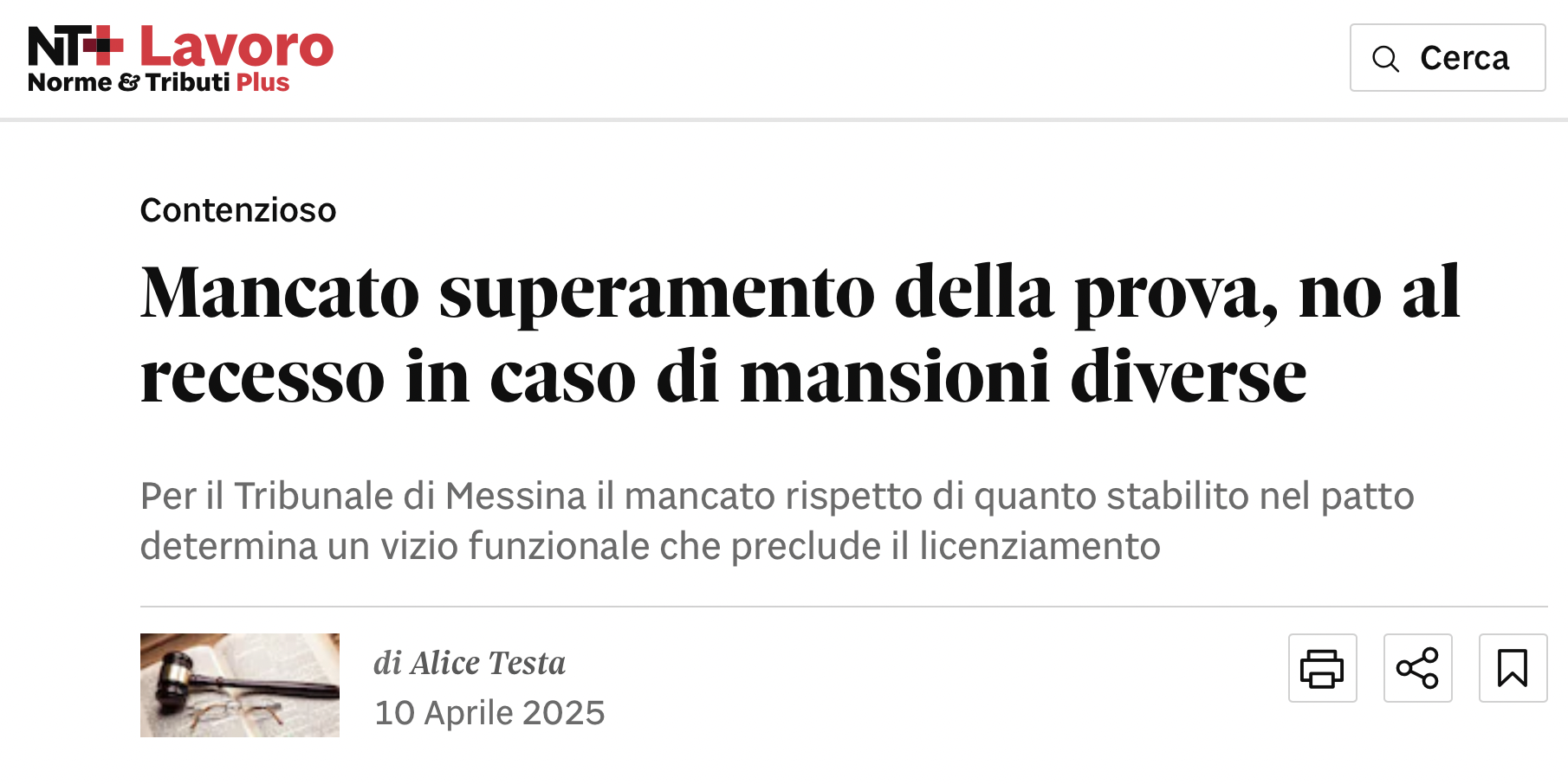Condividiamo l’articolo dell’Avv.to Alice Testa, apparso su NT+ Lavoro il 10 Aprile 2025, che analizza come l’assegnazione del dipendente a mansioni diverse rispetto a quelle indicate nel patto di prova determini un vizio funzionale che non pregiudica la validità del patto stesso, ma comporta il diritto del lavoratore, ove possibile, alla prosecuzione della prova, ovvero al ristoro del pregiudizio sofferto.